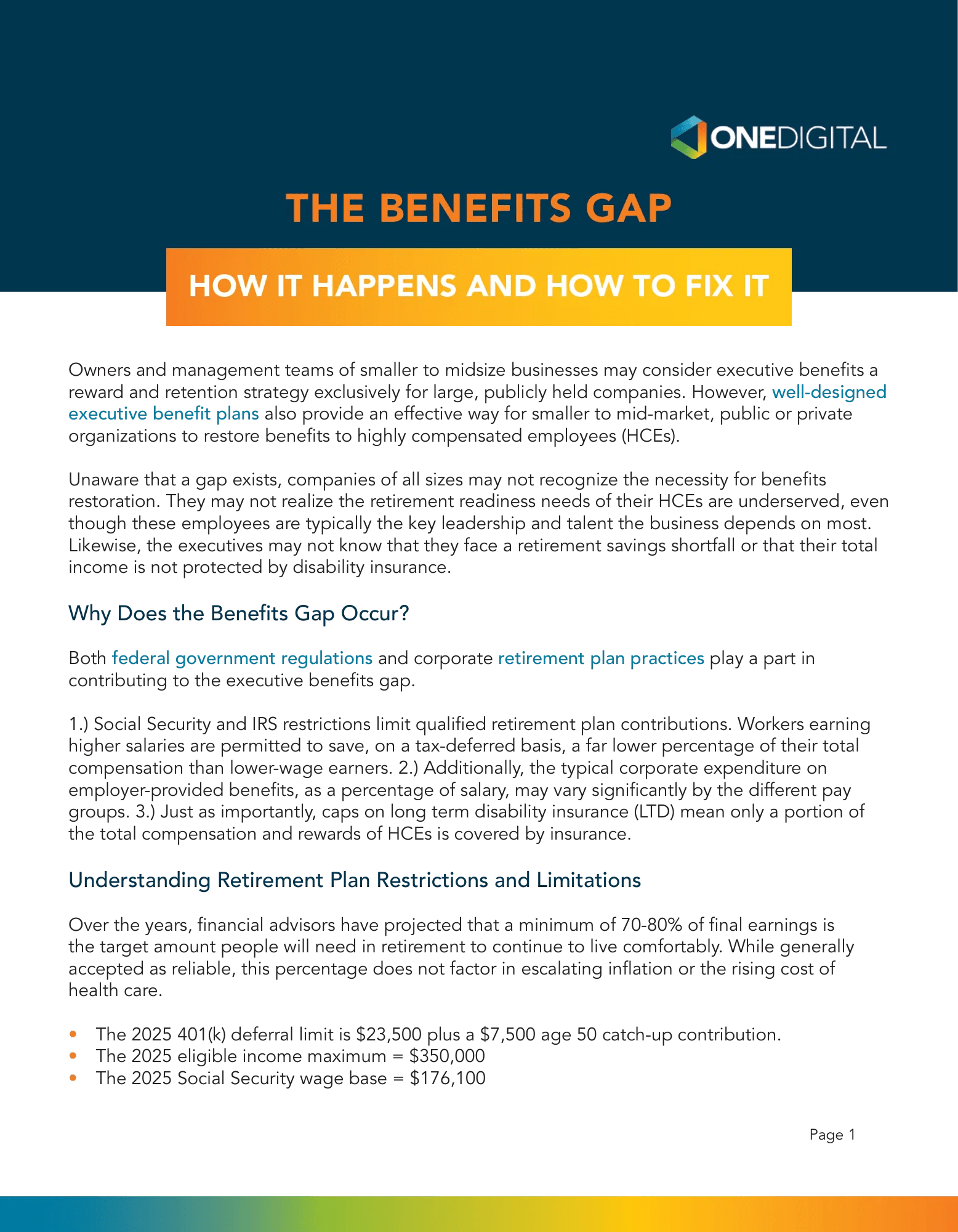 Read The Benefits Gap: How it Happens and How to Fix It for more information on benefits restoration. To learn about other executive benefits strategies go to: How Changes to Dodd-Frank Clawback Policies May Affect Your NQDC Plan and Split Dollar Life Insurance as a Deferred Comp Tool for Not-for-Profit Organizations.