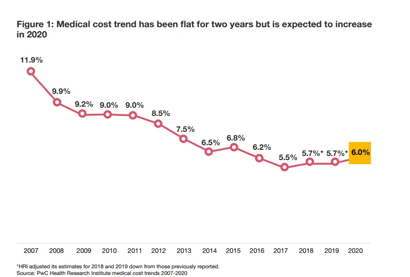 PwC’s Health Research Institute expects a 6.0% increase in 2020, and recent studies by SHRM and The Office of the Actuary at the Centers for Medicare & Medicaid Services (CMS) coincide with these expectations. In fact, healthcare spending has hovered in the 6.0% range for the last several years, a rate that is unsustainable for most employers.