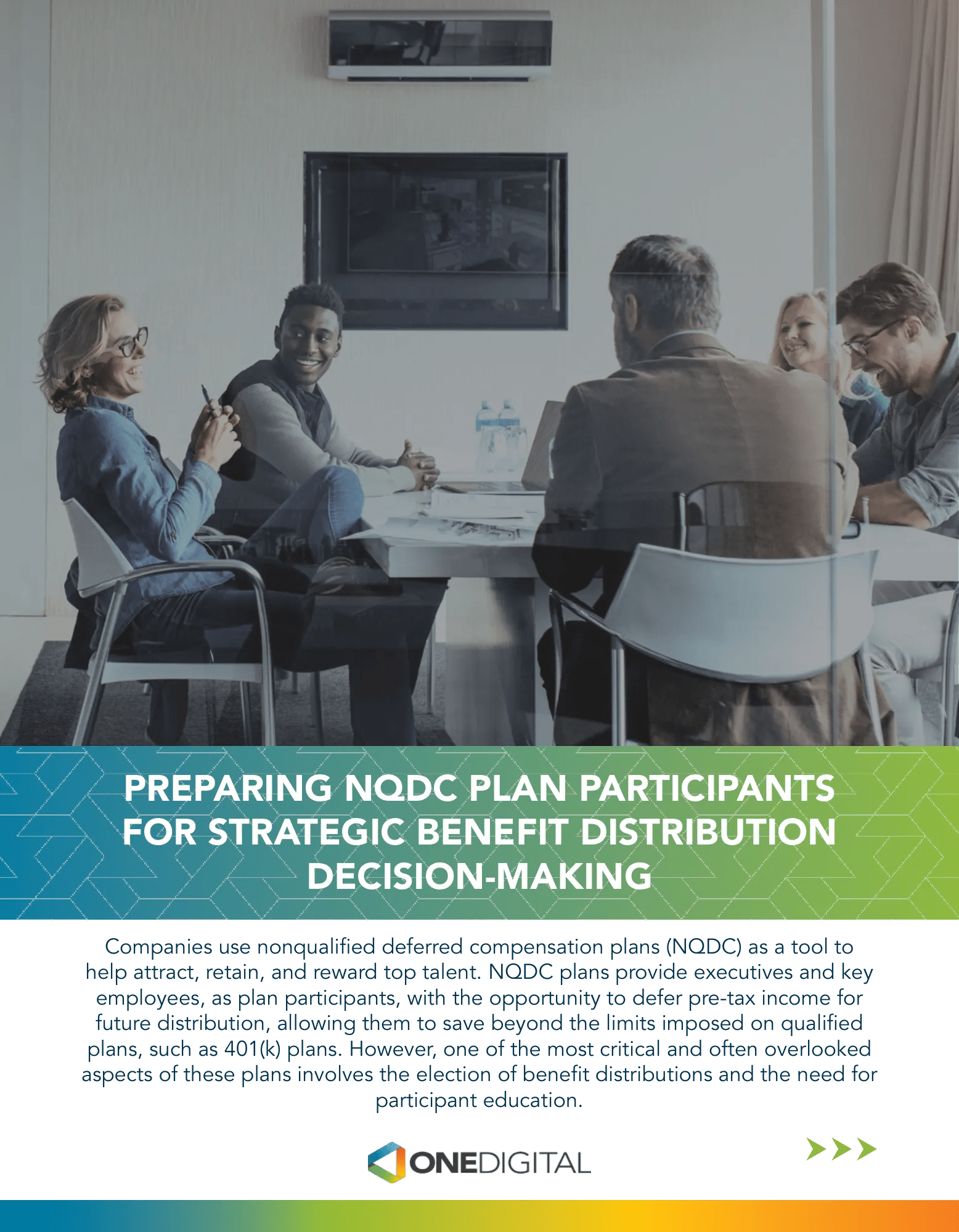 When employees feel supported in their decision-making, they are more likely to grow in confidence in the company and its leadership. An alliance between the plan sponsor and the plan participant helps foster loyalty, boosts satisfaction with executive compensation packages, and strengthens the employer brand. To learn more about how executive benefit strategies can benefit your organization and its employees, contact executivebenefitsolutions@onedigital.com. We invite you to download our deep-dive report, Preparing NQDC Plan Participants for Strategic Benefit Distribution Decision-Making.