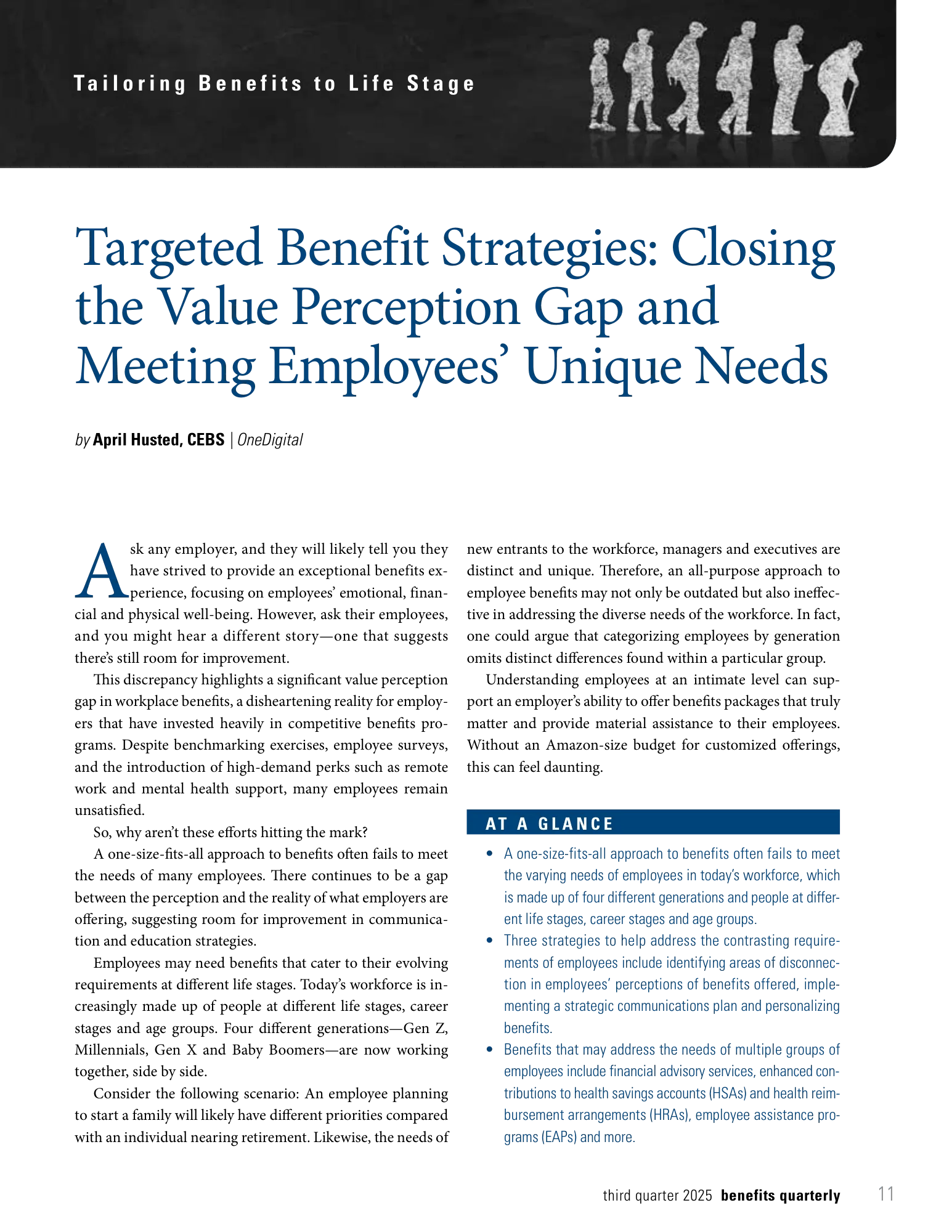 In the latest issue of Benefits Quarterly, April Husted, Senior Managing Principal at OneDigital, shares her insights on how employers can better align their benefits strategies with the diverse life stages of their employees. Her article, “Tailoring Benefits to Life Stage,” explores how targeted benefits and strategic communication can help close the gap between what employers offer and what employees truly value.