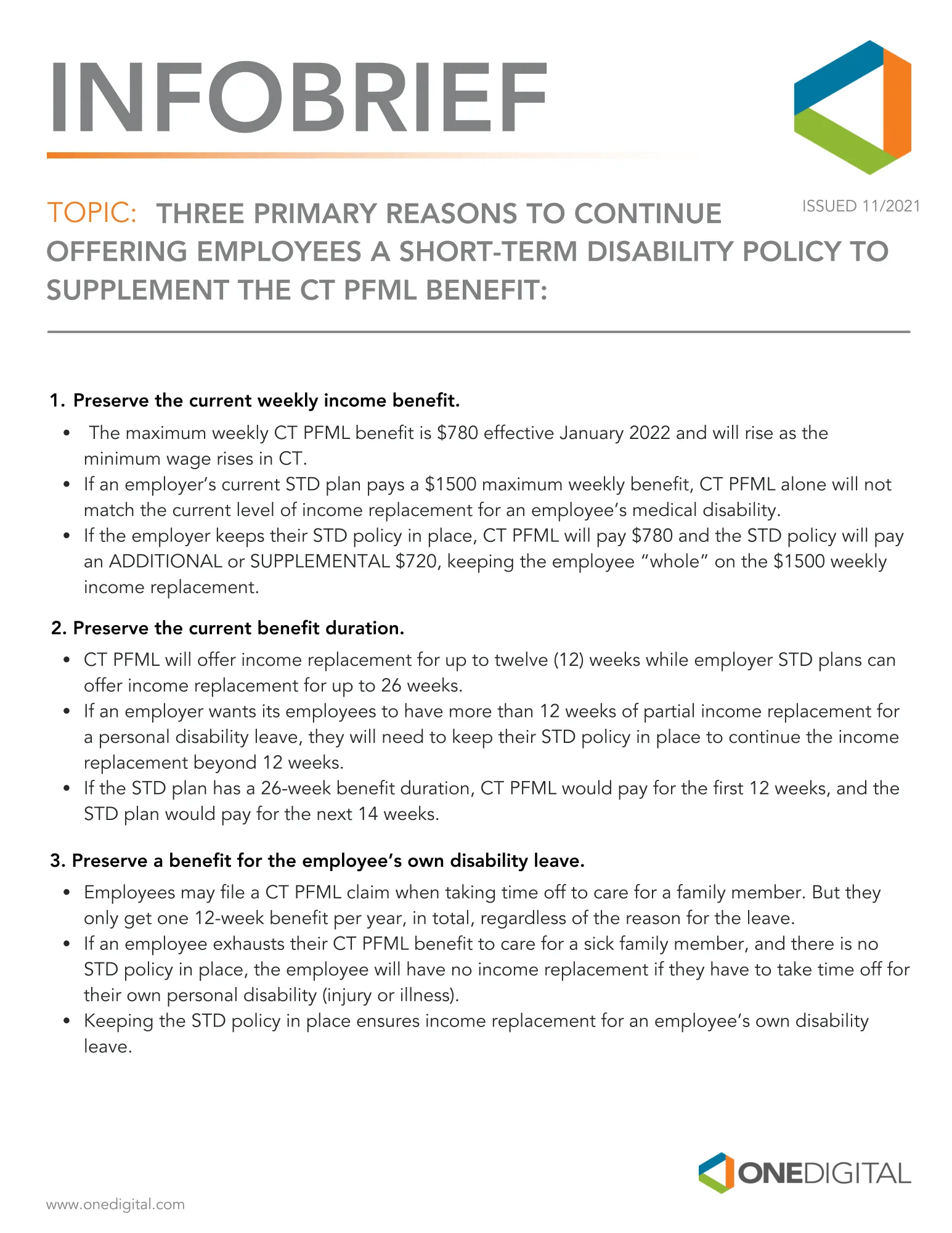 Here are three primary reasons to continue offering employees an STD policy to supplement the CT PFML benefit: